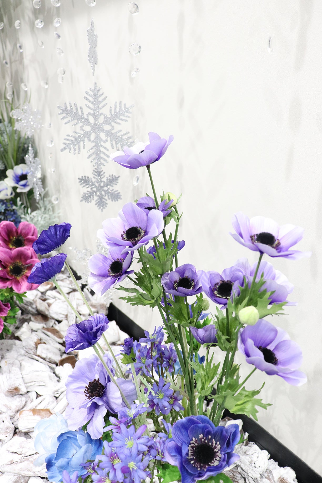 冷たい寒さを雪の結晶のオブジェと白のウッドチップで表現し、春が近づく様子を色とりどりのアネモネの花材で表現しています。